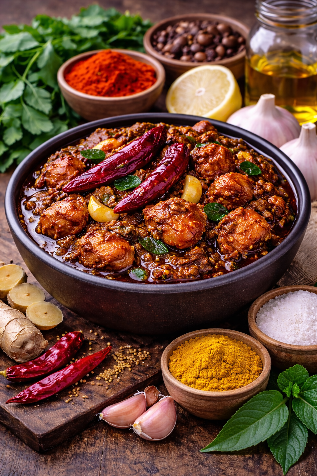 A rich and spicy non-vegetarian pickle made with tender chicken pieces marinated in ginger-garlic paste, lemon juice, and traditional spices. Blended with red chilli powder, turmeric, roasted poppy seeds, and salt, the chicken is slow-cooked in pure groundnut oil to develop deep flavor and long shelf life.