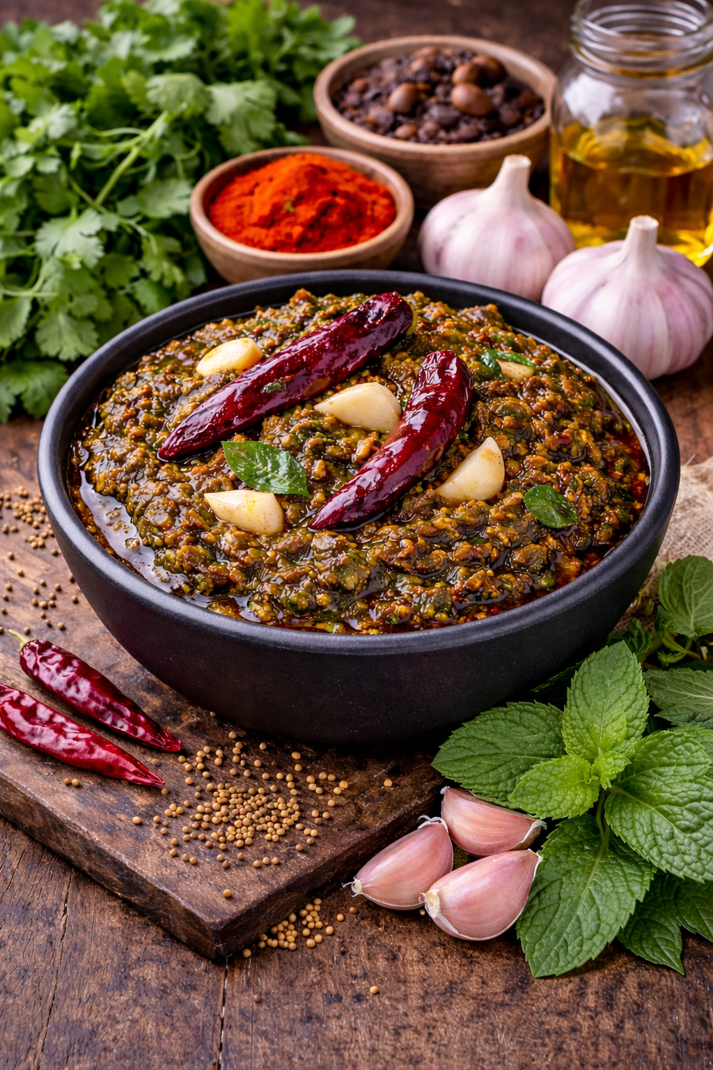 A flavorful and aromatic pickle made with fresh coriander leaves, blended with tangy tamarind and a touch of jaggery for a perfect balance of spice and mild sweetness. Infused with dried red chillies, roasted fenugreek powder, and salt, this traditional pickle is slow-mixed with pure groundnut oil to enhance its rich aroma and shelf life.