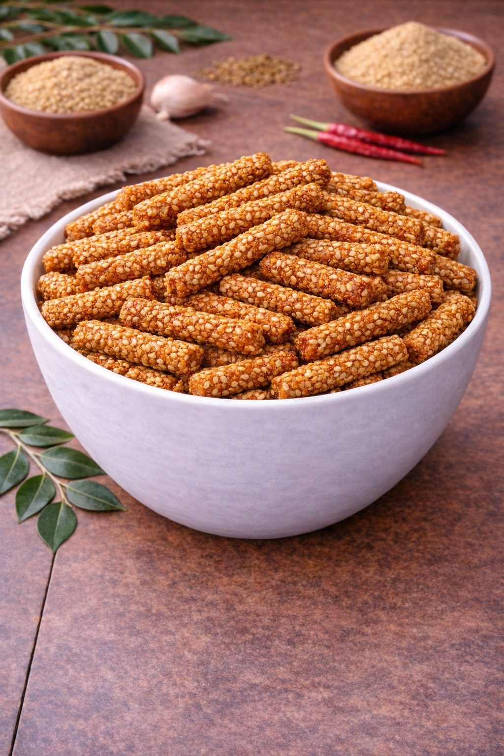 Ingredients: Rice flour, Butter, Salt, Red chilli powder, Sunflower oil, Seaseme.